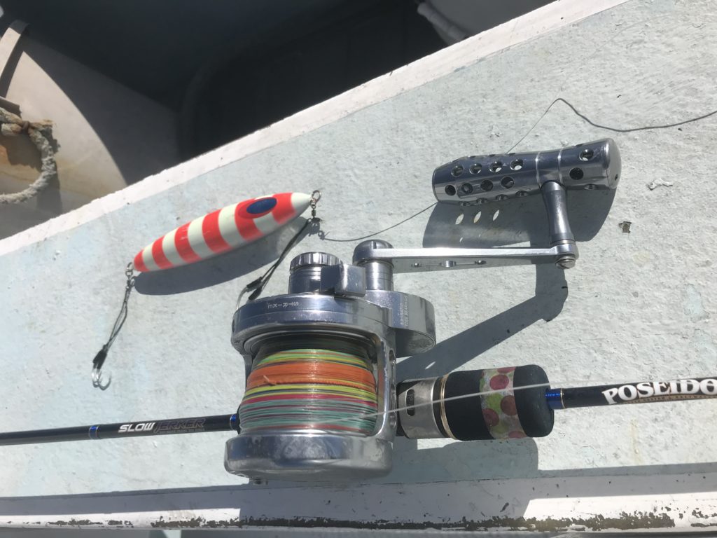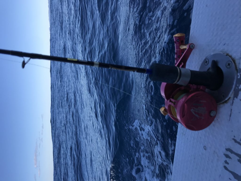 潮の流れはあったり〜なかったりですが、上側の潮が流れて、ちょっとづつ早くなっているのか釣りにくい状況なってきてます。数回「ふわっと」したあたりでなんともいえない微妙な反応とりあえず巻き取りスタートします。残り200mぐらいからラインの負荷が斜めになり付いてるかな?と巻き続けていると