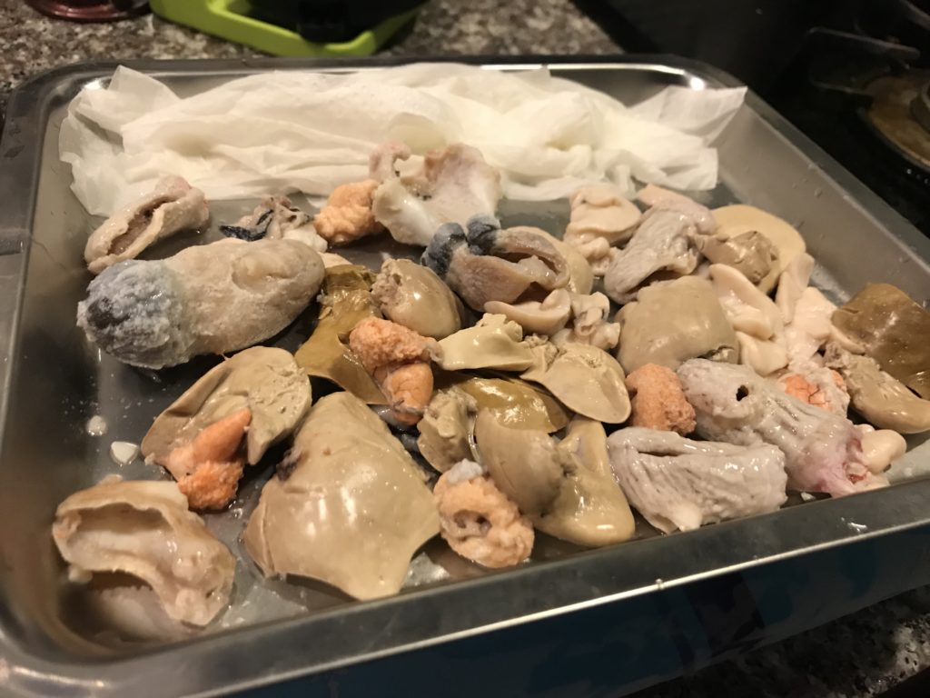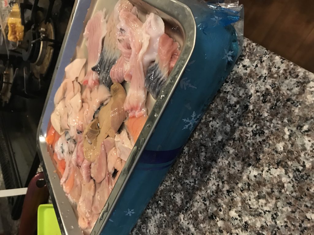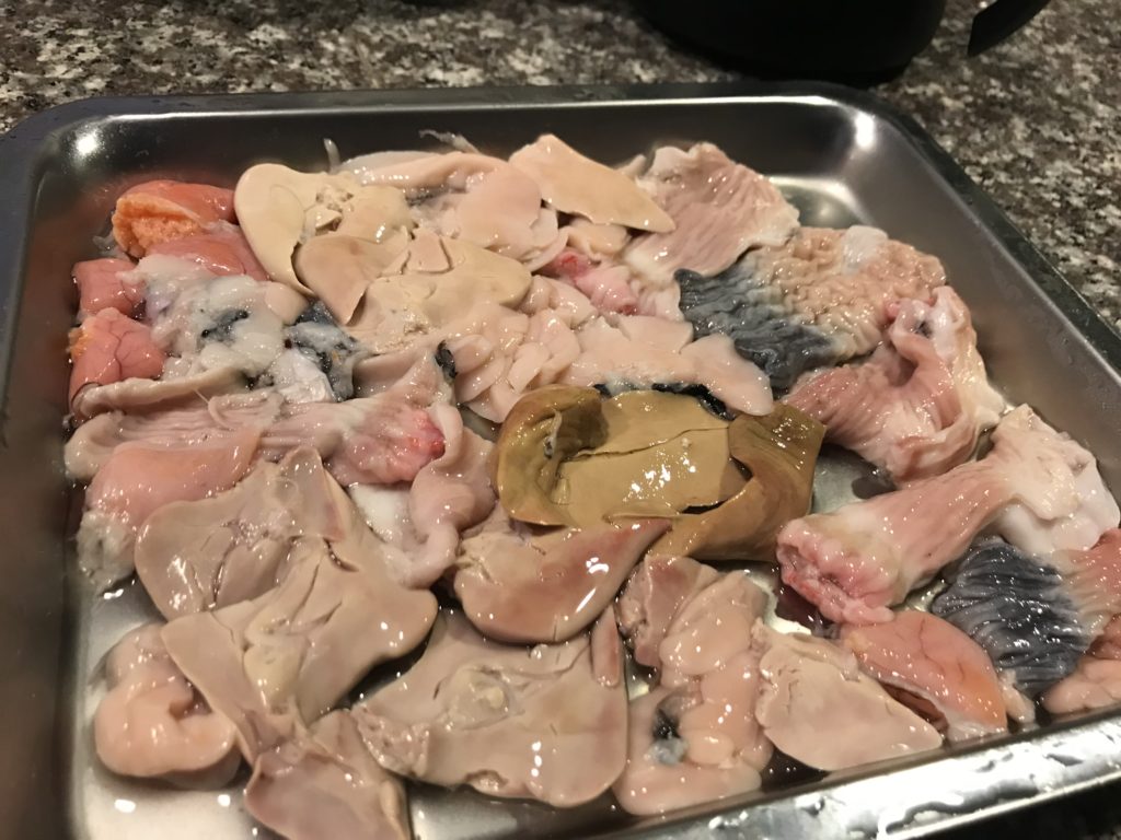 6匹+2匹分の内臓たちです。冷水で綺麗に洗い流して、板氷の上に金属のプレートを置いてお酒に2hほど置きます。