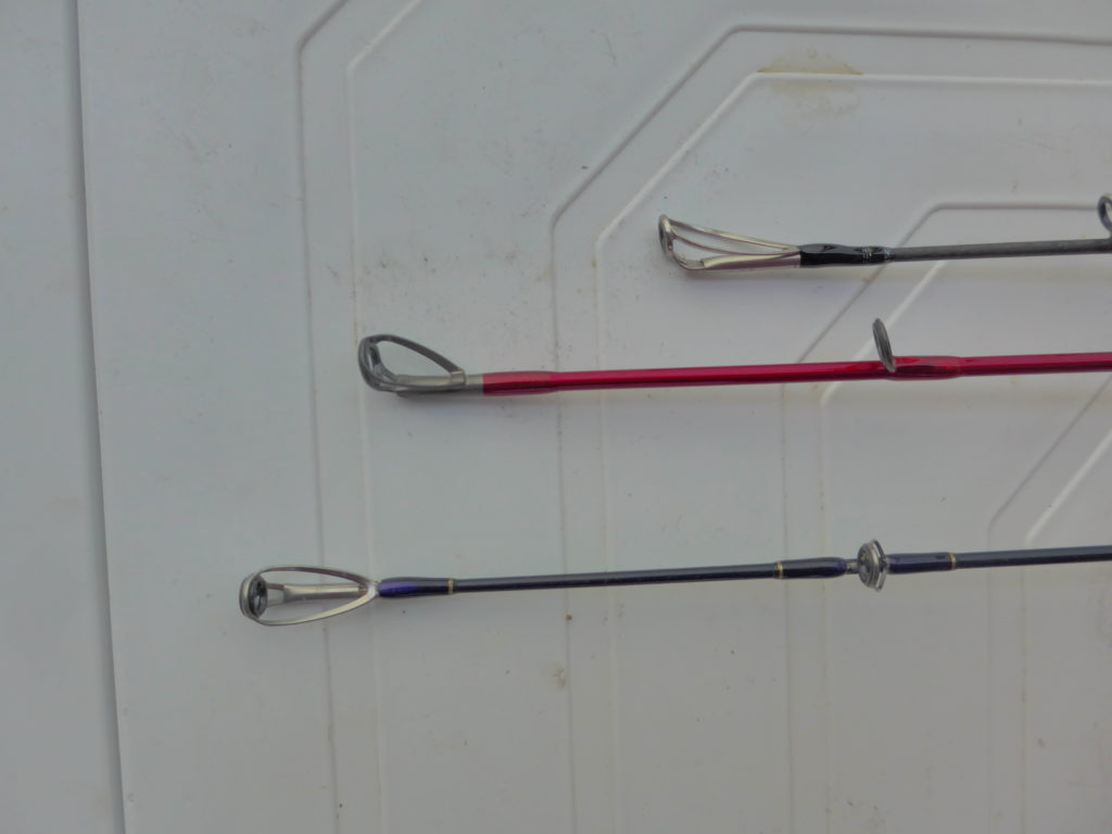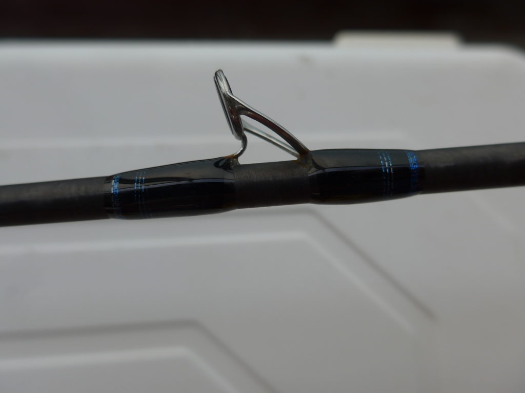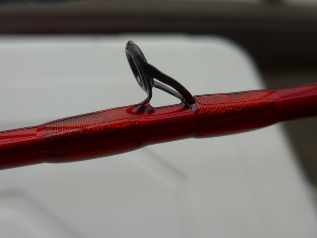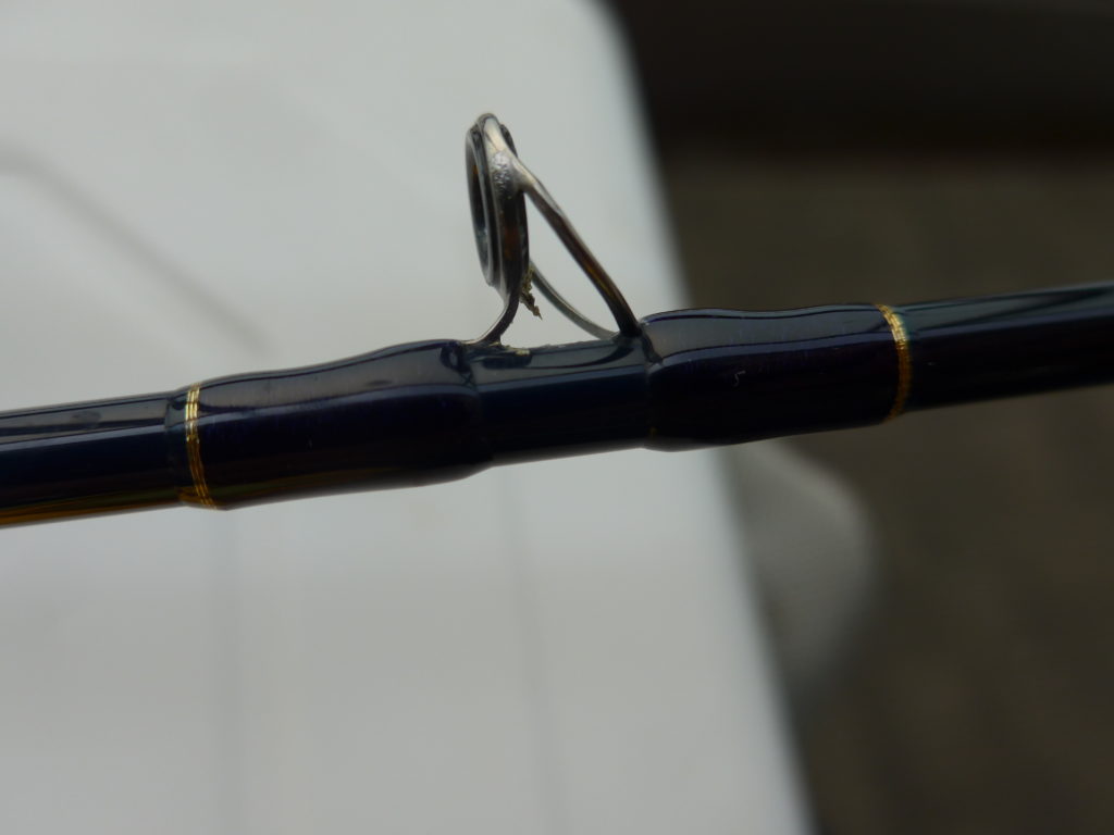 リールに一番近い側のガイドが低いとリールとガイドの角度がつくため、ラインがここでテンションがかかり、ラインに負荷がかかります。よくここで「ペキペキ」音がなっているので、少しでもラインをまっすぐ通す必要があり、ここのガイドはリール側の手前のガイドは少し高い方がいい。これば深海リール使っている時の「あるある」ですね。