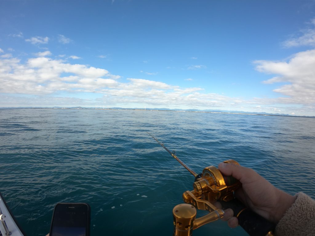 10時過ぎになったのでタチ場に向かいます。船はまばらですが、先行の船はすでにポロポロと揚げているのが見えます。状況は悪くはないようです。120m前後で魚探の反応もあるようなので早速三人で150-210gのジグ を落とします。