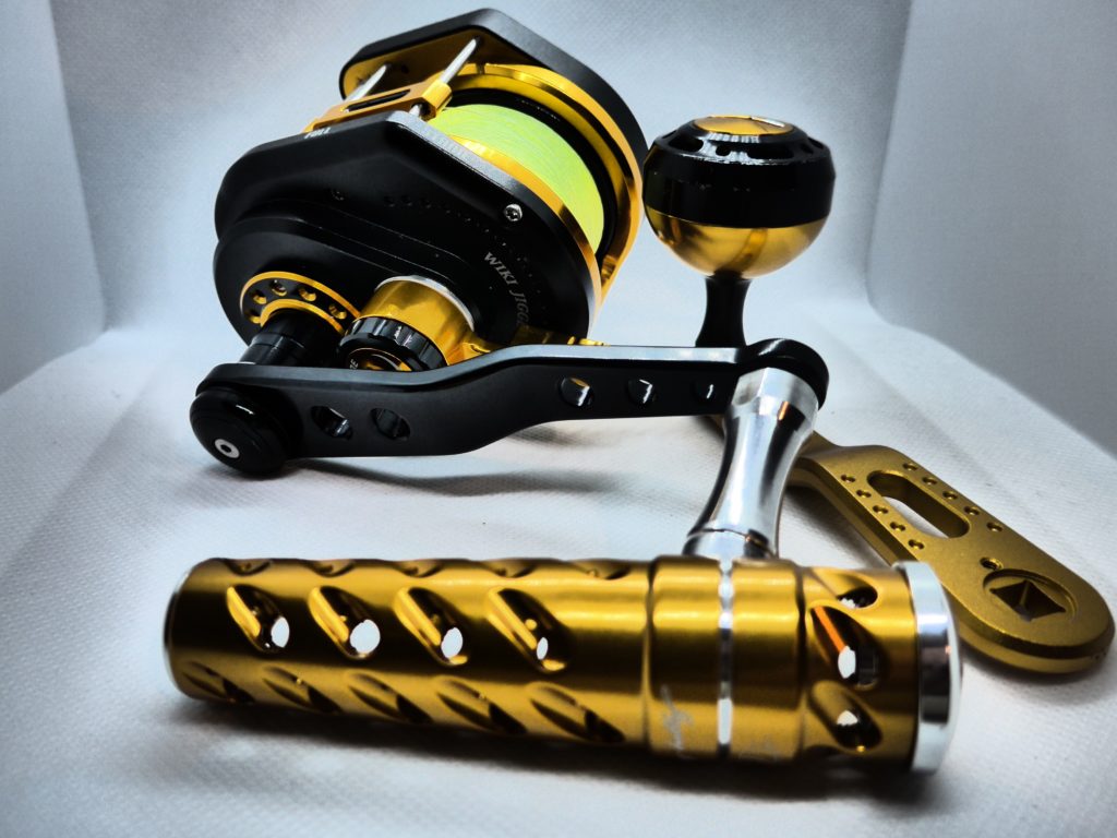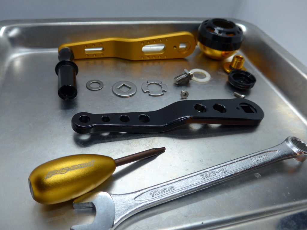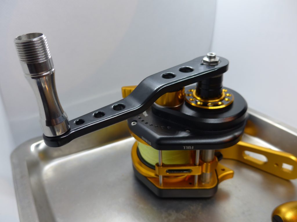でリールチューンしてみます。VS-3000にもPE7以降にも取り付け可能です。PEはハンドルがT-barなのであれですが、長くしたい場合は変更可能です。カラーはゴールドとブラックです。リールと同時購入で有れば交換して入荷の対応も可能です。