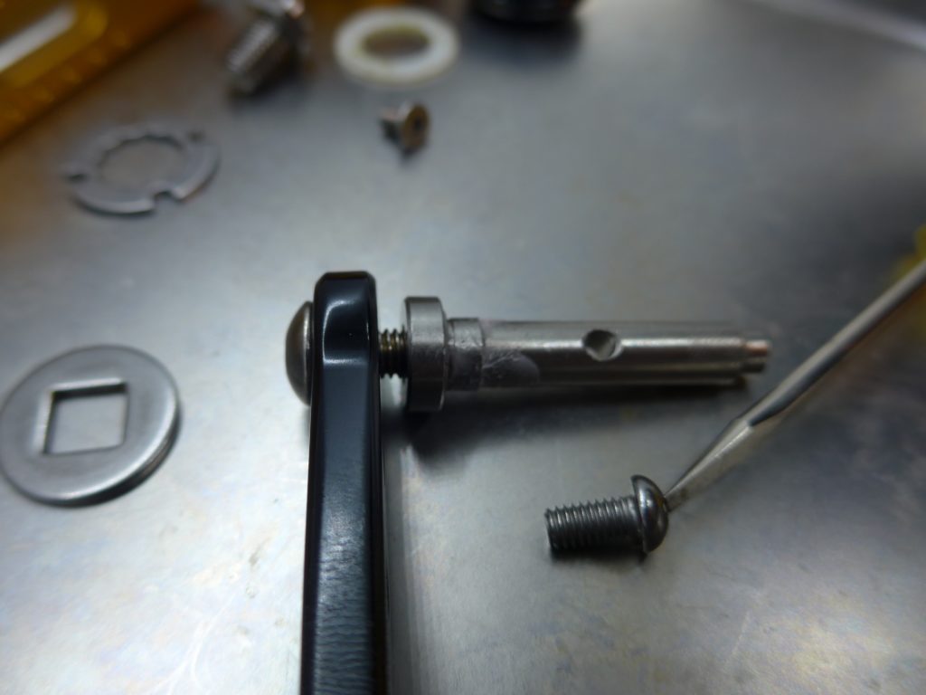 いつもこちらのブログには書いていますが、ここが逆ネジです。通常の締め付け方法とは逆になります。右に回すと緩んで、左に回すと締め付けられます。内部のシャフトに穴が空いてるのでここに何か丸棒入れながら締め付けてみてください。