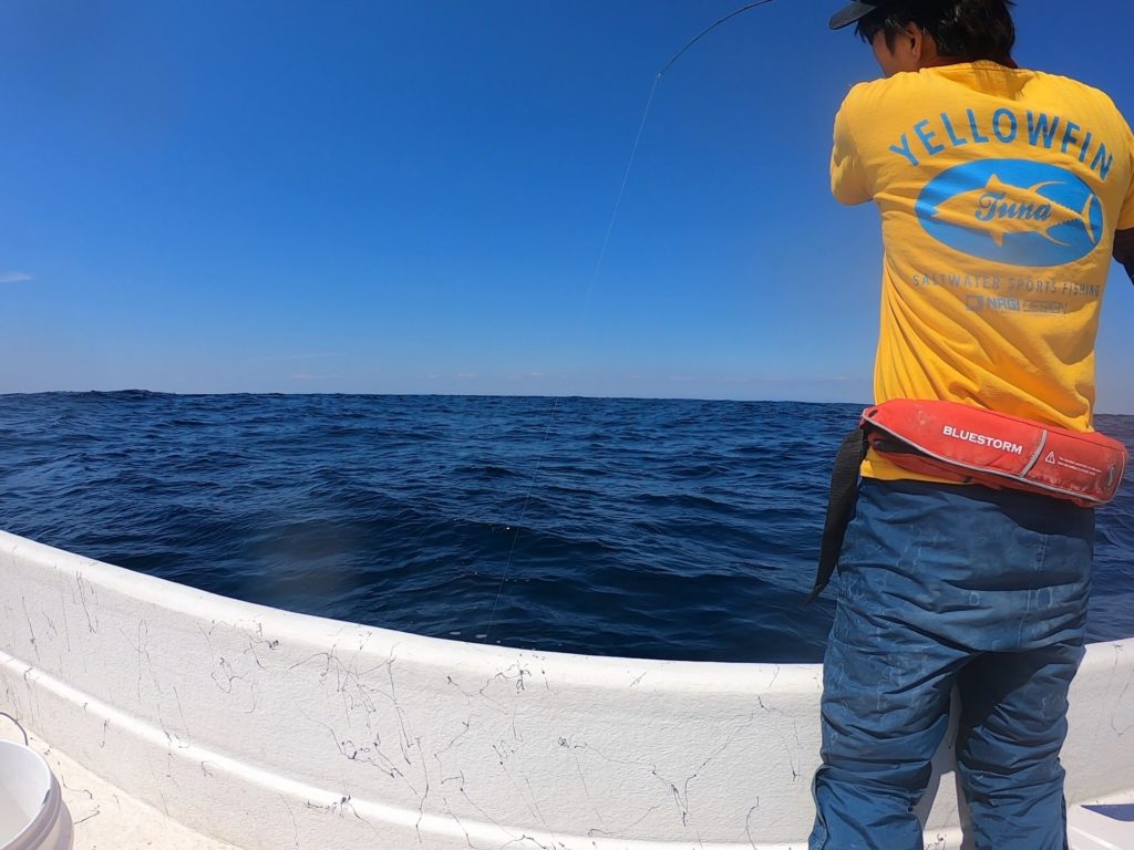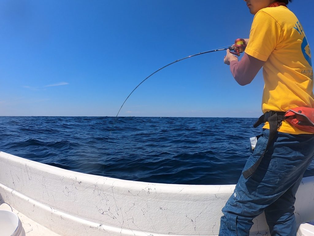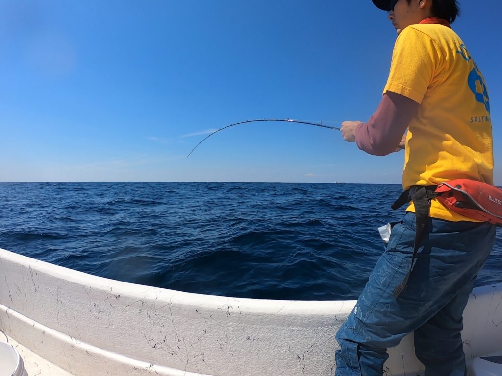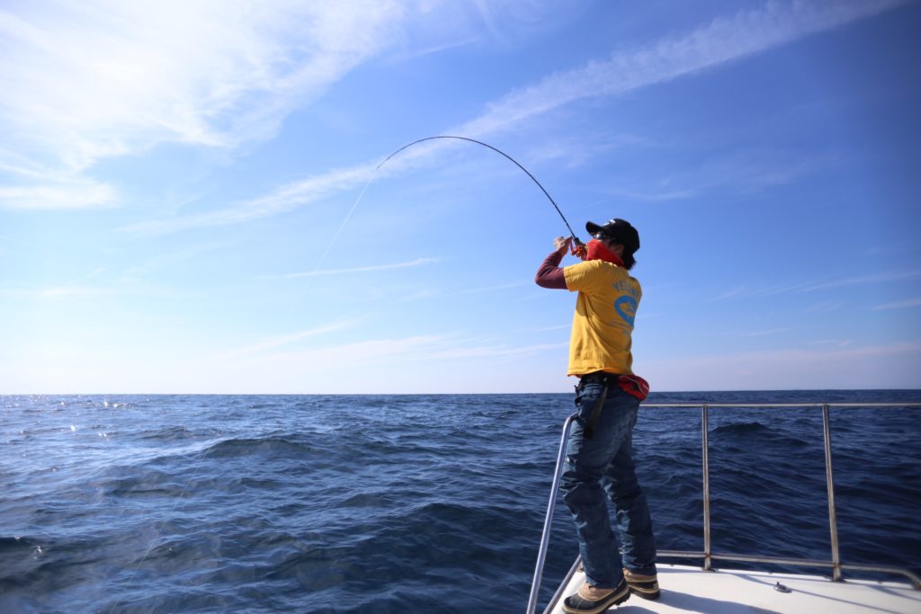 船の上下を利用してジグをフロントから飛ばすアクションです。