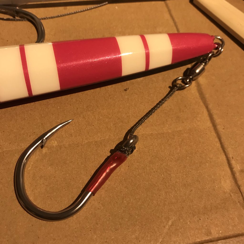 最初は内掛け一回は不安でしたが、実際にバラムツもこれで上がってるので今回はもう不安無し。針と糸で処理する必要もないから簡単な方かと思います。