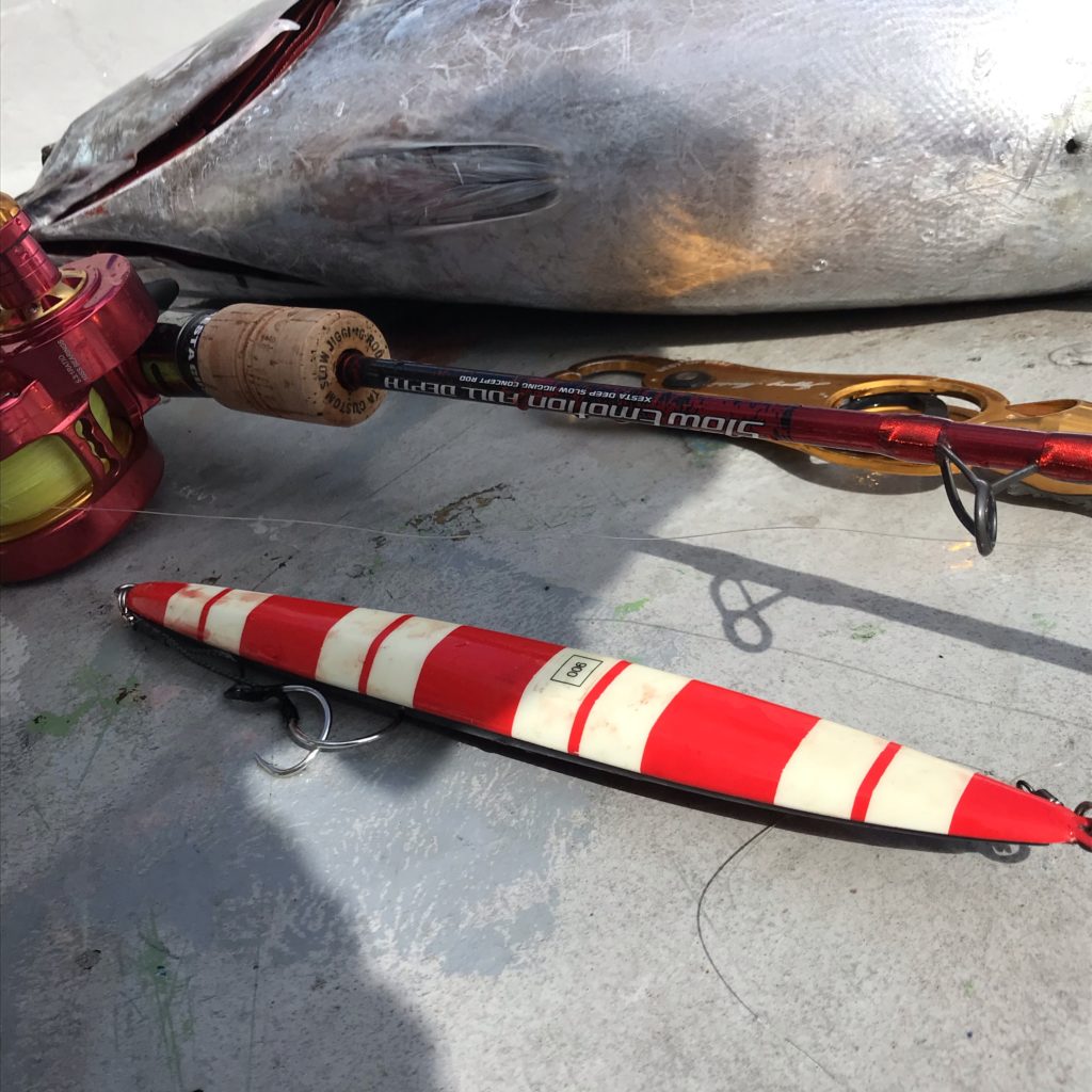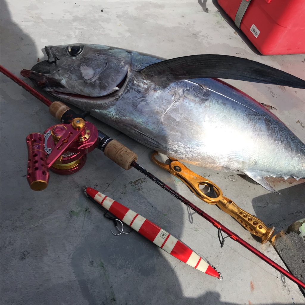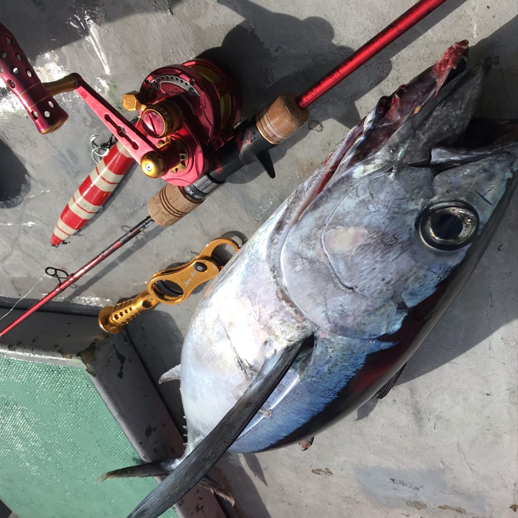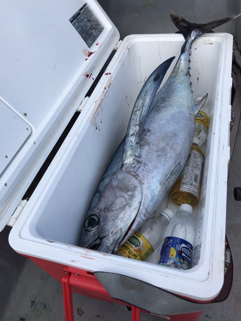どうでしょう。10kgはありそうな立派なビンチョウマグロ、横のヒレがトビウオと言われる由縁の通り、立派なヒレです。三重に行こうかと悩んでいましたが、今回釣れて満足してしまいました。(多分)