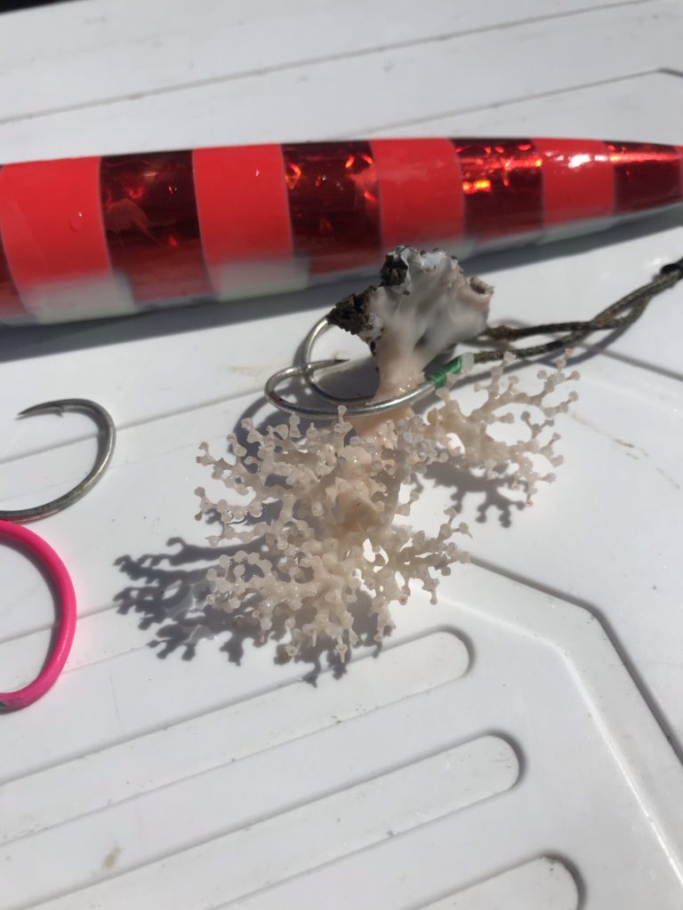 ただ、今日はひたすらに「あたり」がない餌でさえもあたりがない。ジグでの釣果は「サンゴ礁」のみ😅 3人30本の餌を底にこれだけ這わして「赤い魚」が1匹も見れないと諦めがつきます。最終最後の流しで初めて「3人30本」の針がある中でなんと最後に「ホウズキ」が1匹上がって来ただけでした。