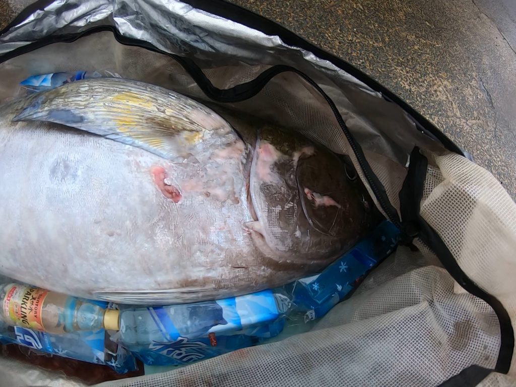 このサイズだと尾っぽはバックに入りません。全部出っ放しでした。マグロバック使ってわかったこと
