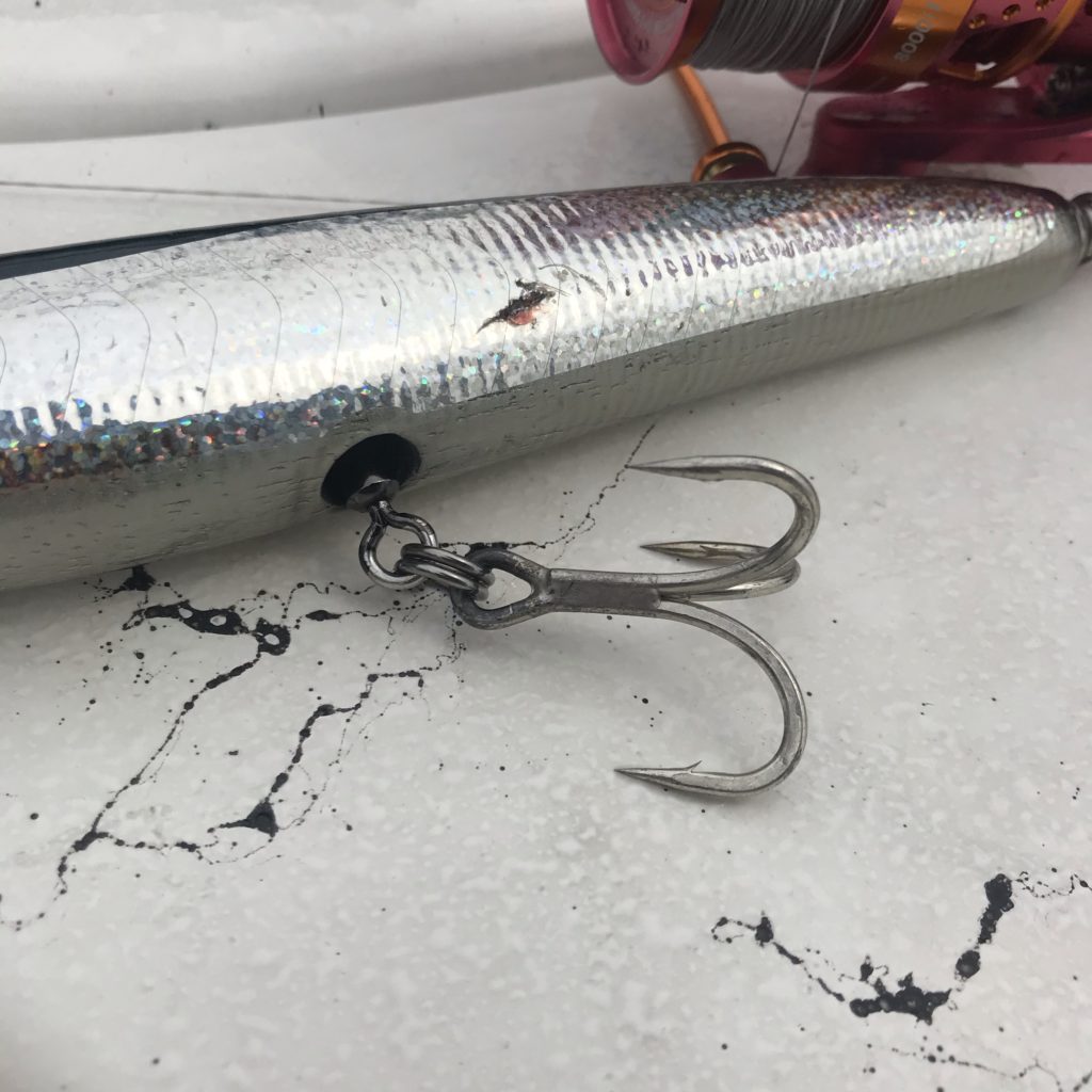 完全に向こう合わせでフロントフックが「トリプルフック」に、しかも「リアフック」も下顎にかかっています。あとで気づいたのですが、リアのアイが「グイッ」と曲がってました。