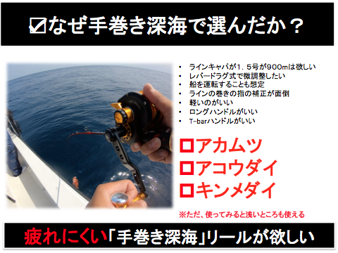 レベルワインダーなしでも、きれいにできるし、できる人もいますが、いざ使ってみるとやっぱりべんりですね。船の操舵を考えると、手巻き深海&操舵をやるなら、レベルワインダーはおすすめです。